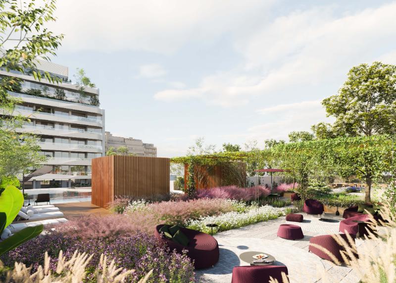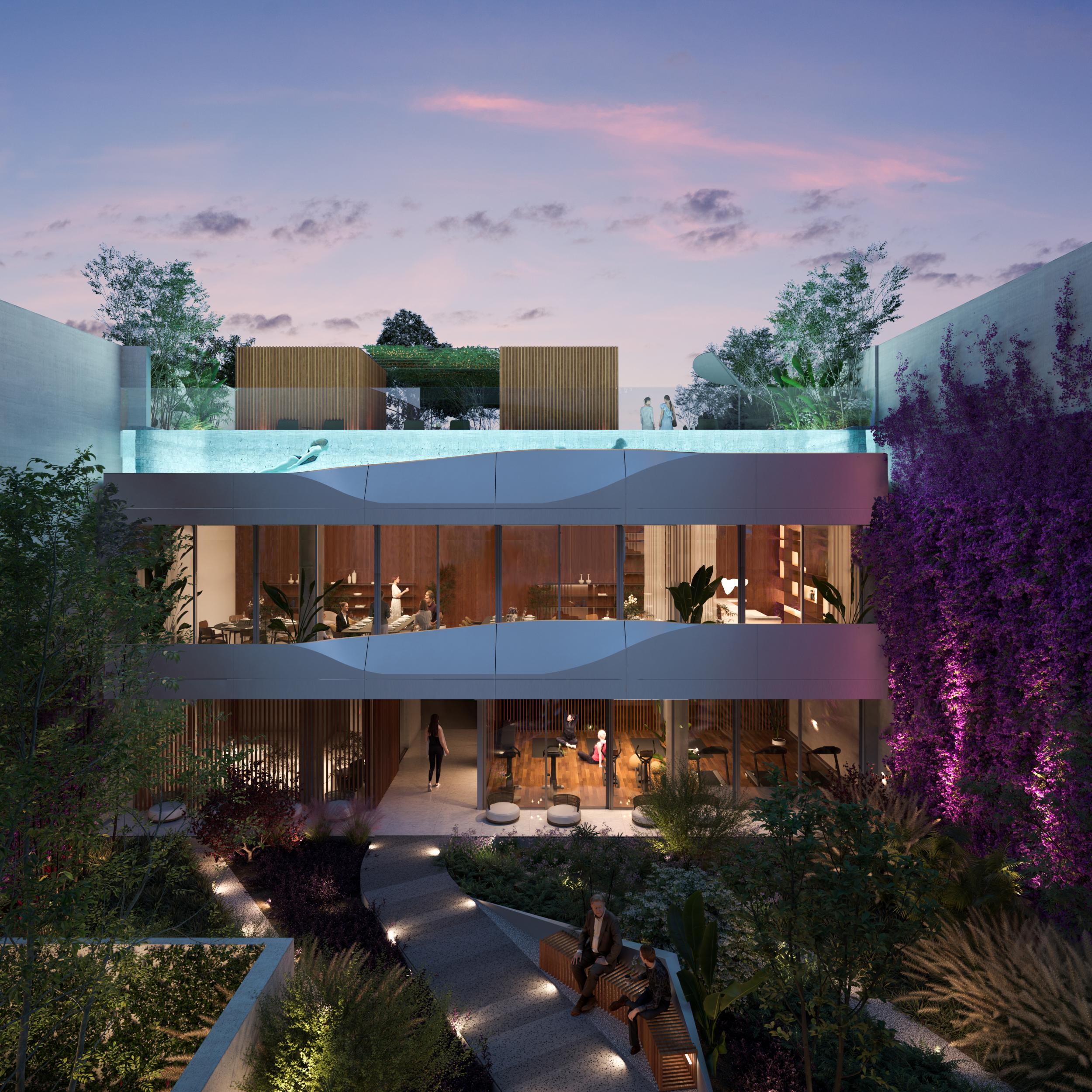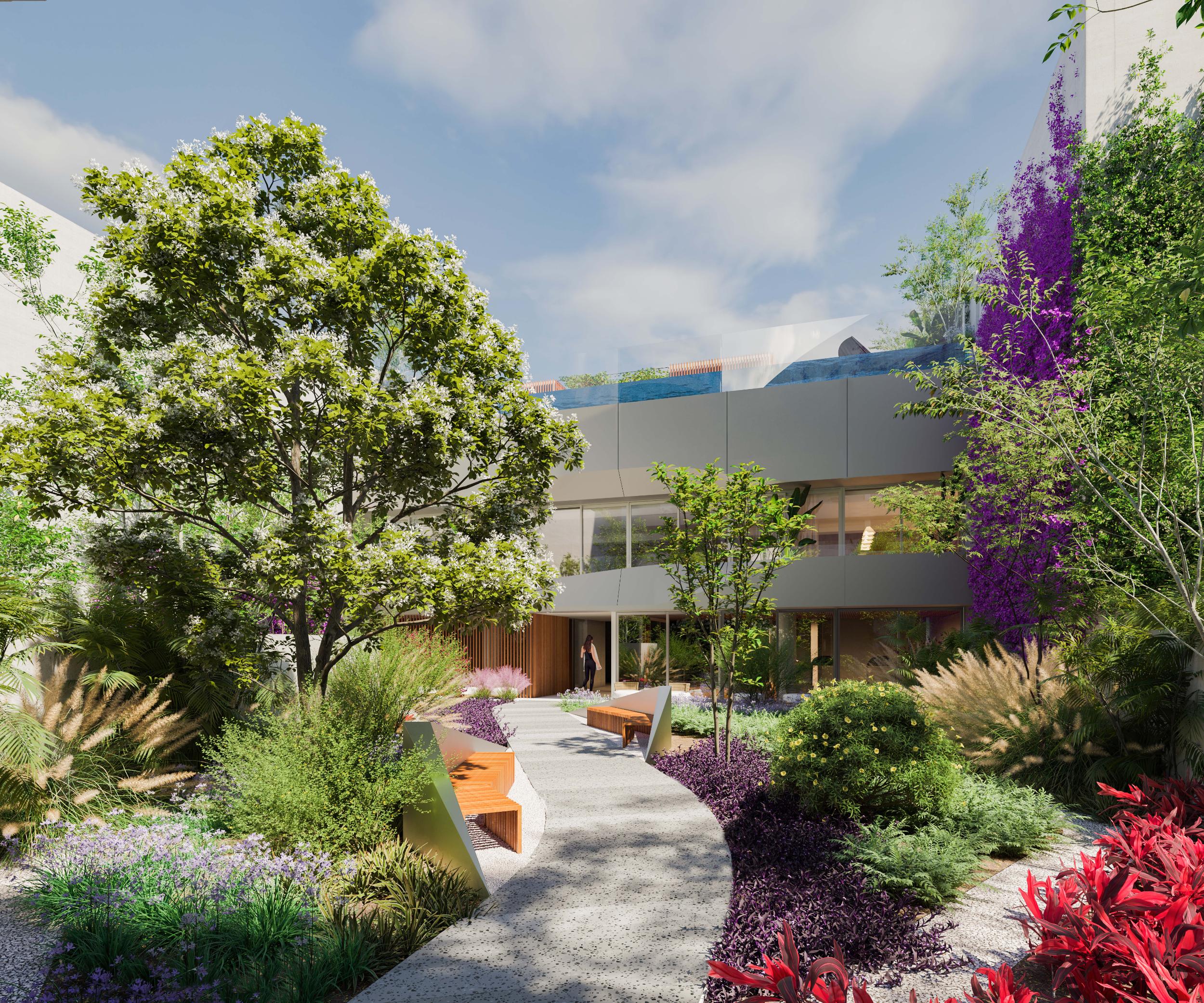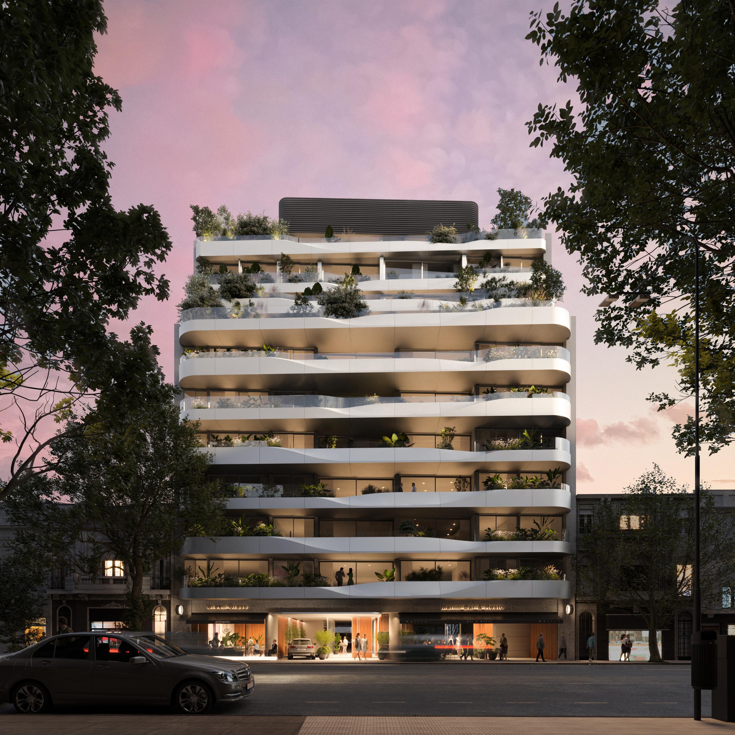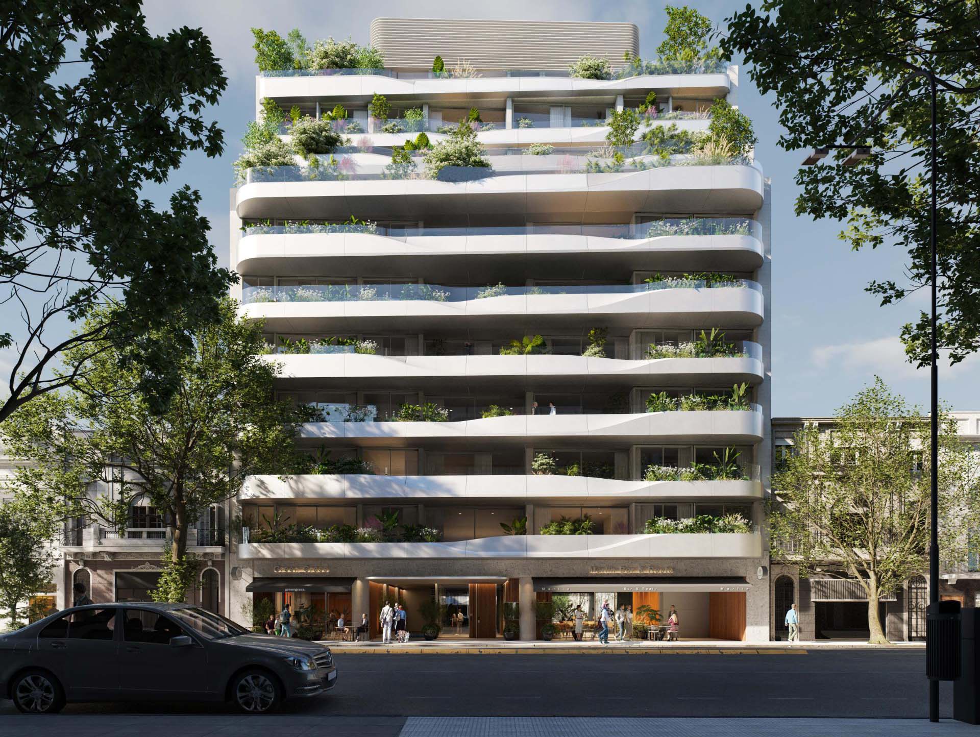 DONNA SETTIMA es un desarrollo compuesto por un edificio principal de 10 pisos y un jardín central que conecta con un edificio anexo de 3 pisos.