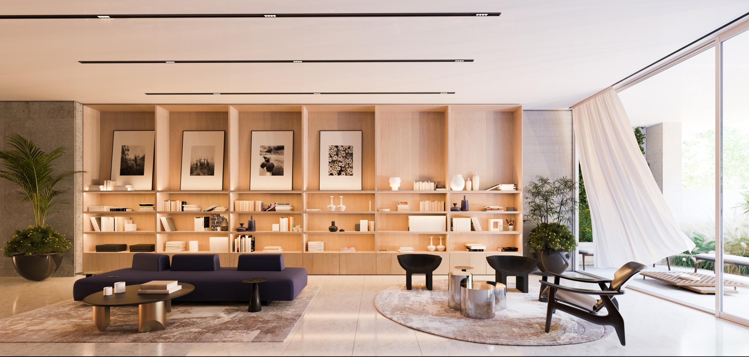 El lobby cuenta con pisos de mármol, revestimientos de madera, maceteros con vegetación e iluminación cálida, mientras que el coworking cuenta con mesas de trabajo, bibliotecas y espacios para reuniones.